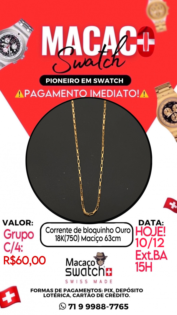 • 1 Corrente de bloquinho Ouro 18K(750) Maciço 63cm